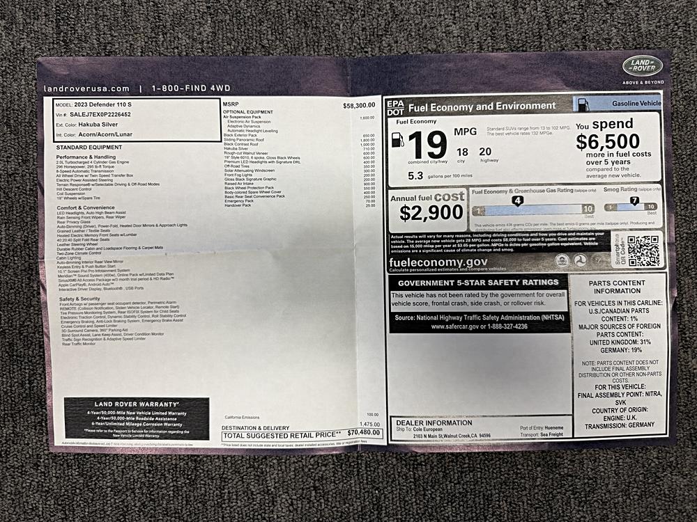 Star City Motors present this super low mileage 2023 Land Rover Defender 110 S AWD for sale. Only 5500 original…